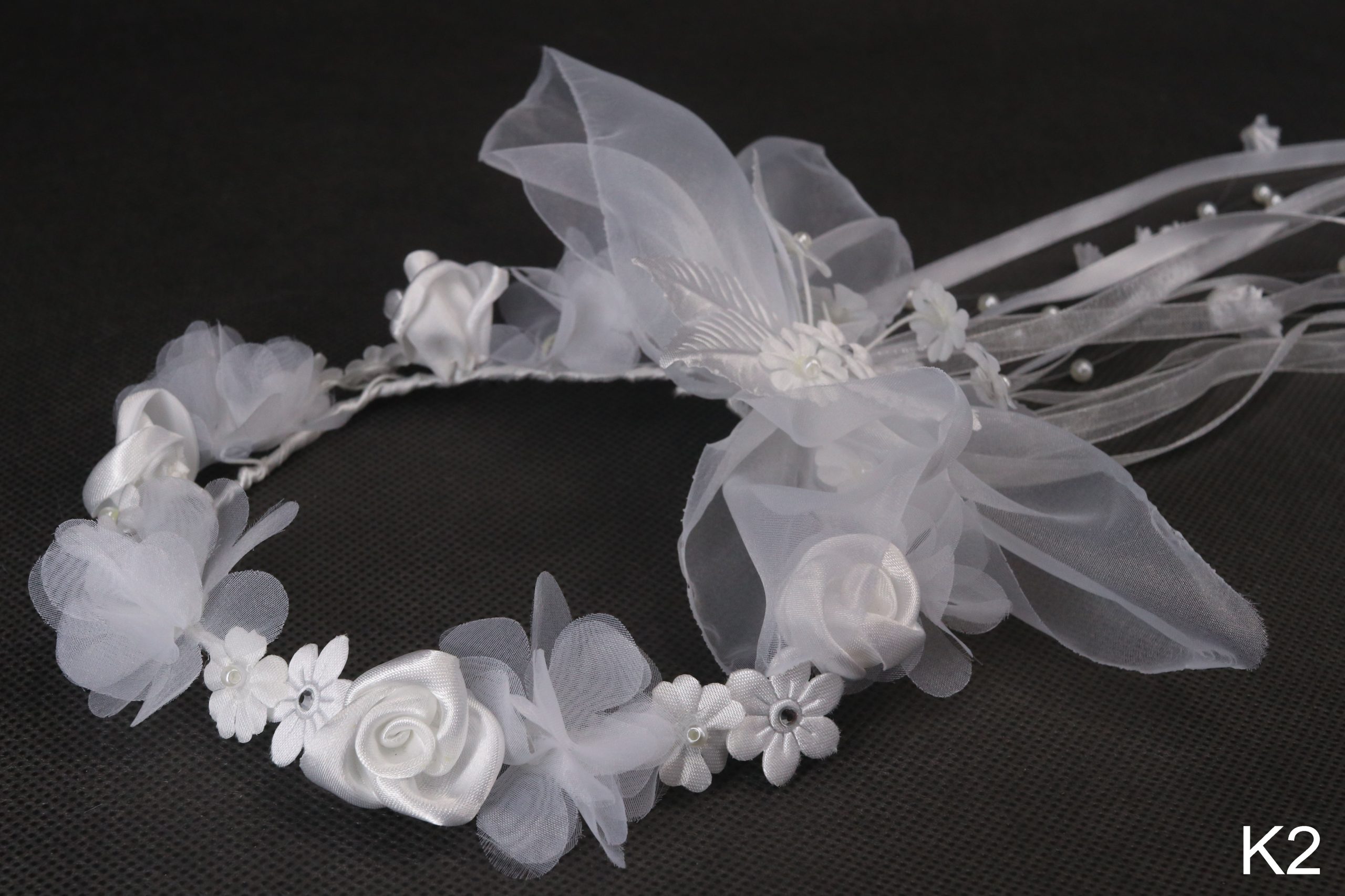 Wianek na koczek wykonany z białych szyfonowych kwiatów w połączeniu z atłasowymi ręcznie wykonanymi różyczkami jest elegancką ozdobą na włosy dla dziewczynki zakończony szyfonowa okazałą rozetą.