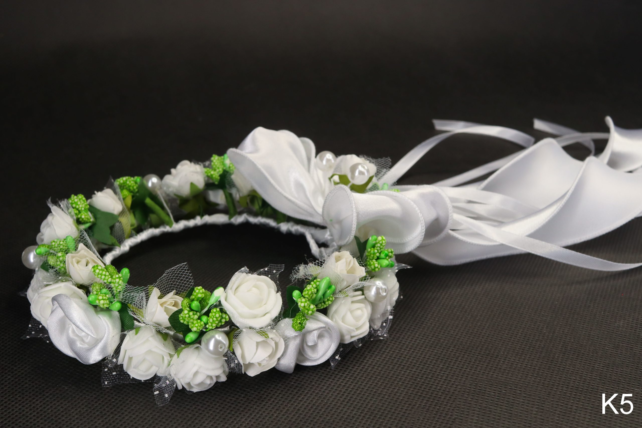 Wianek na koczek wykonany ręcznie z piankowych różyczek oraz atłasowych ręcznie robionych różyczek z dodatkiem pereł, zielonych ozdobników. Zakończony atłasowa kokarda i zwisającymi lokami.