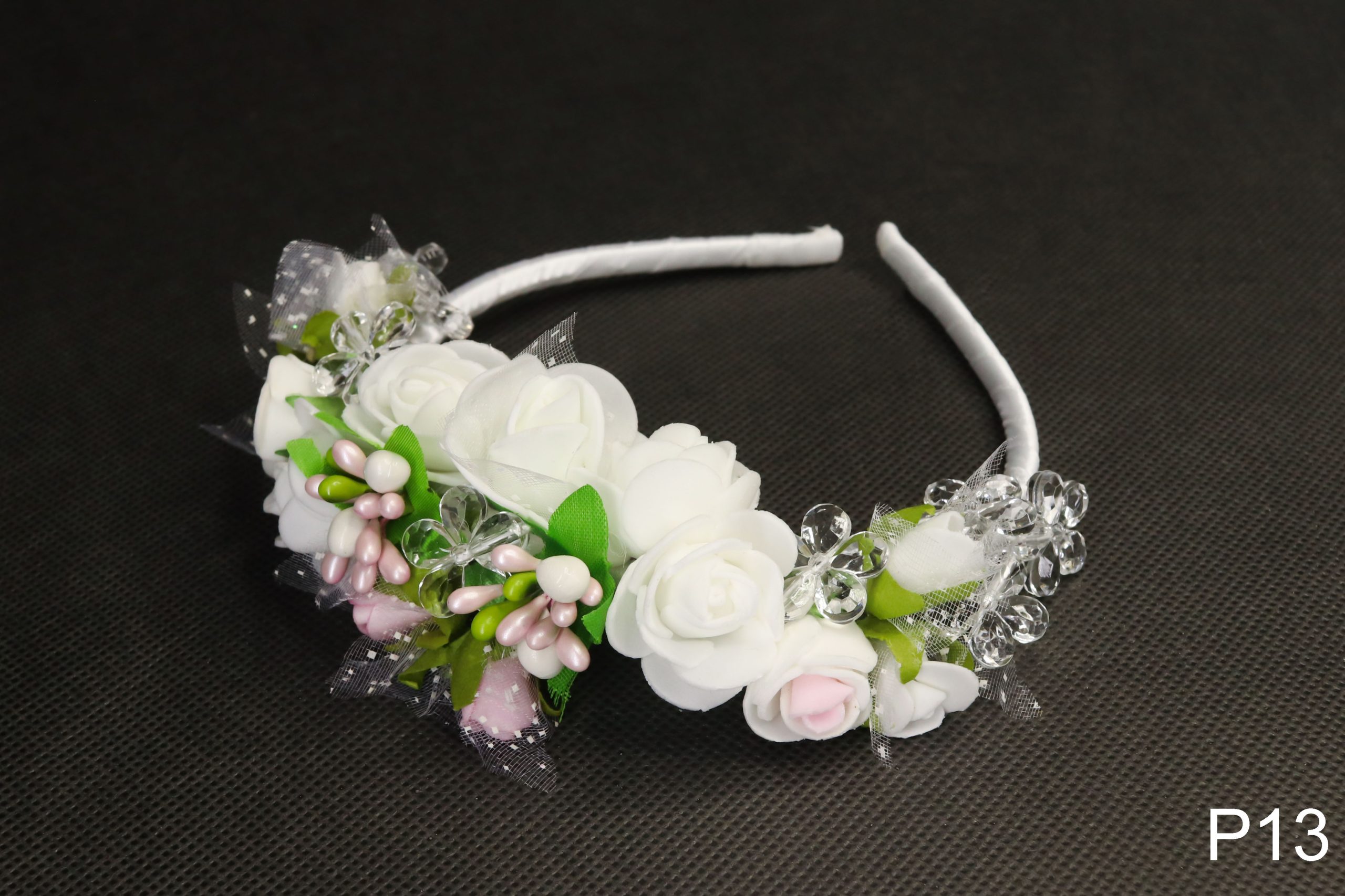 Przepaska wykonana ręcznie. Ozdoba pasuje dla dziewczynek z każdą fryzurą i składa się z białych i różowych różyczek, ozdobników z zielonym listeczkiem oraz mieniących się akrylowych kwiatuszków.