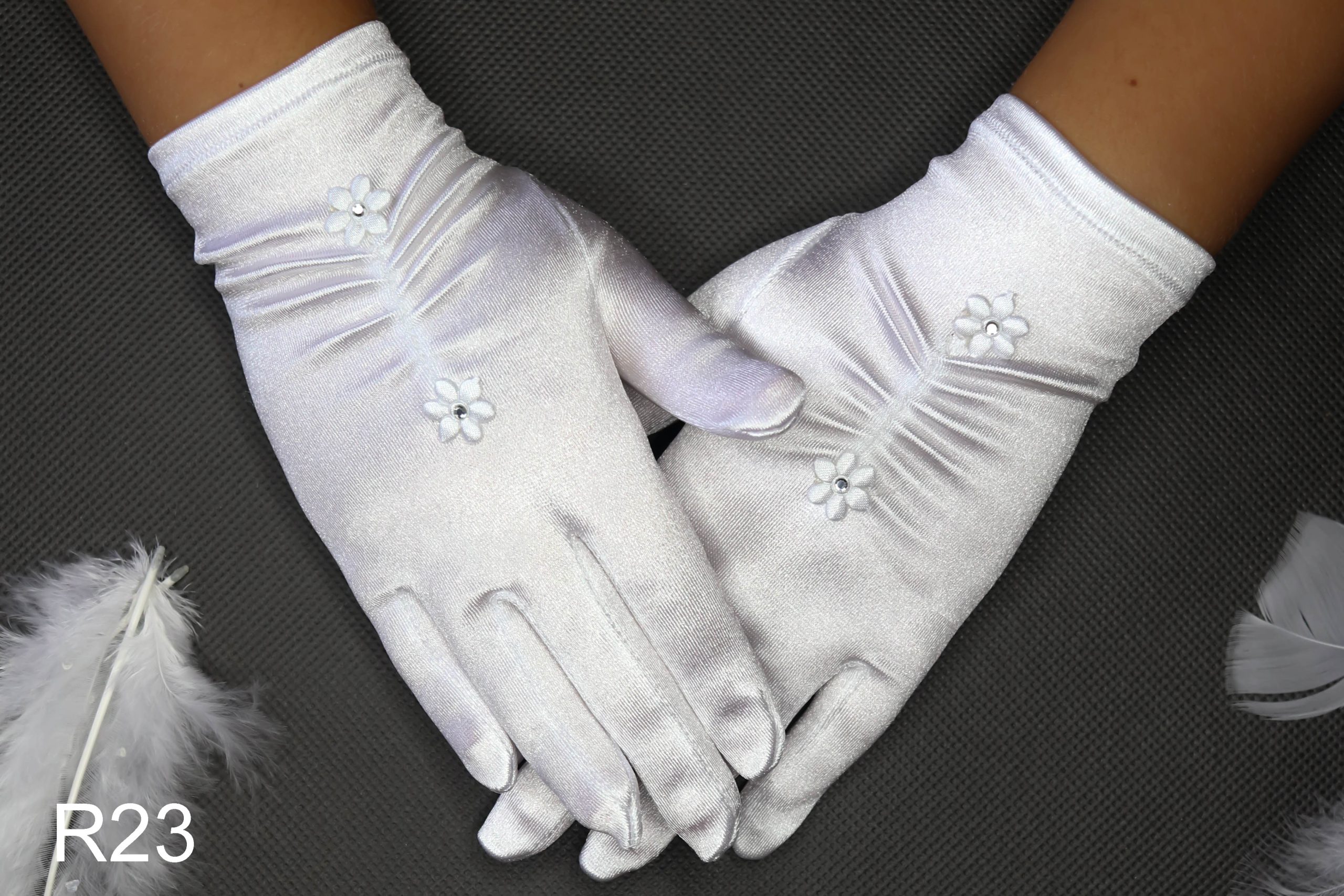 Rękawiczki komunijne ,pełne błyszczące dla dziewczynek ,na środku zmarszczone i ozdobione dwoma malutkimi kwiatuszkami z cyrkoniami.