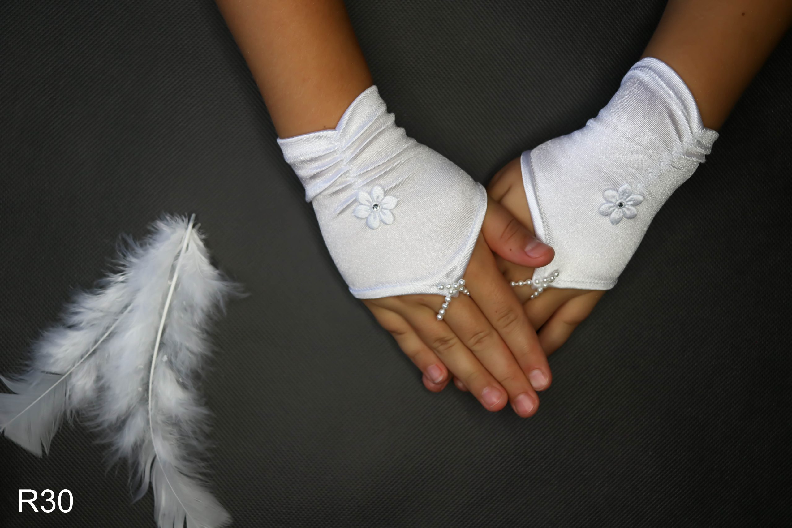 Rękawiczki komunijne krótkie ,na jeden palec .Uszyte z rozciągliwej lycry. Marszczone i ozdobione satynowym kwiatkiem z cyrkonią. Rękawiczki występują w dwóch rozmiarach standard oraz dla dziewczynek o grubszej budowie ciała.