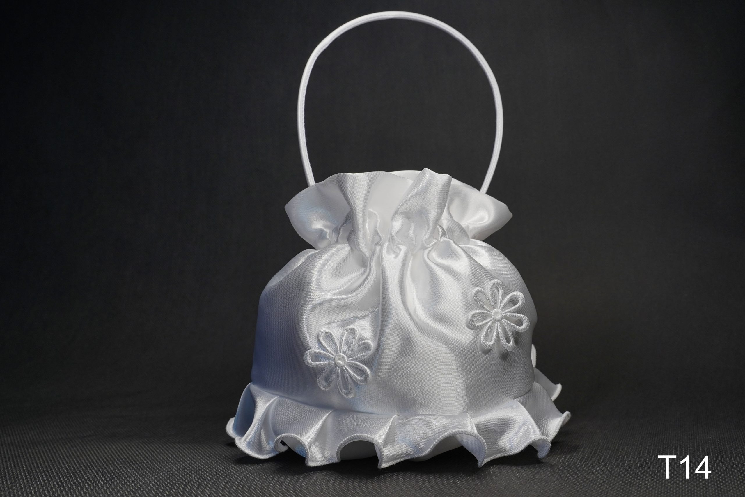 Woreczek komunijny satynowy ,ze sztywną rączka.Ozdobiony dużymi ażurowymi kwiatkami.