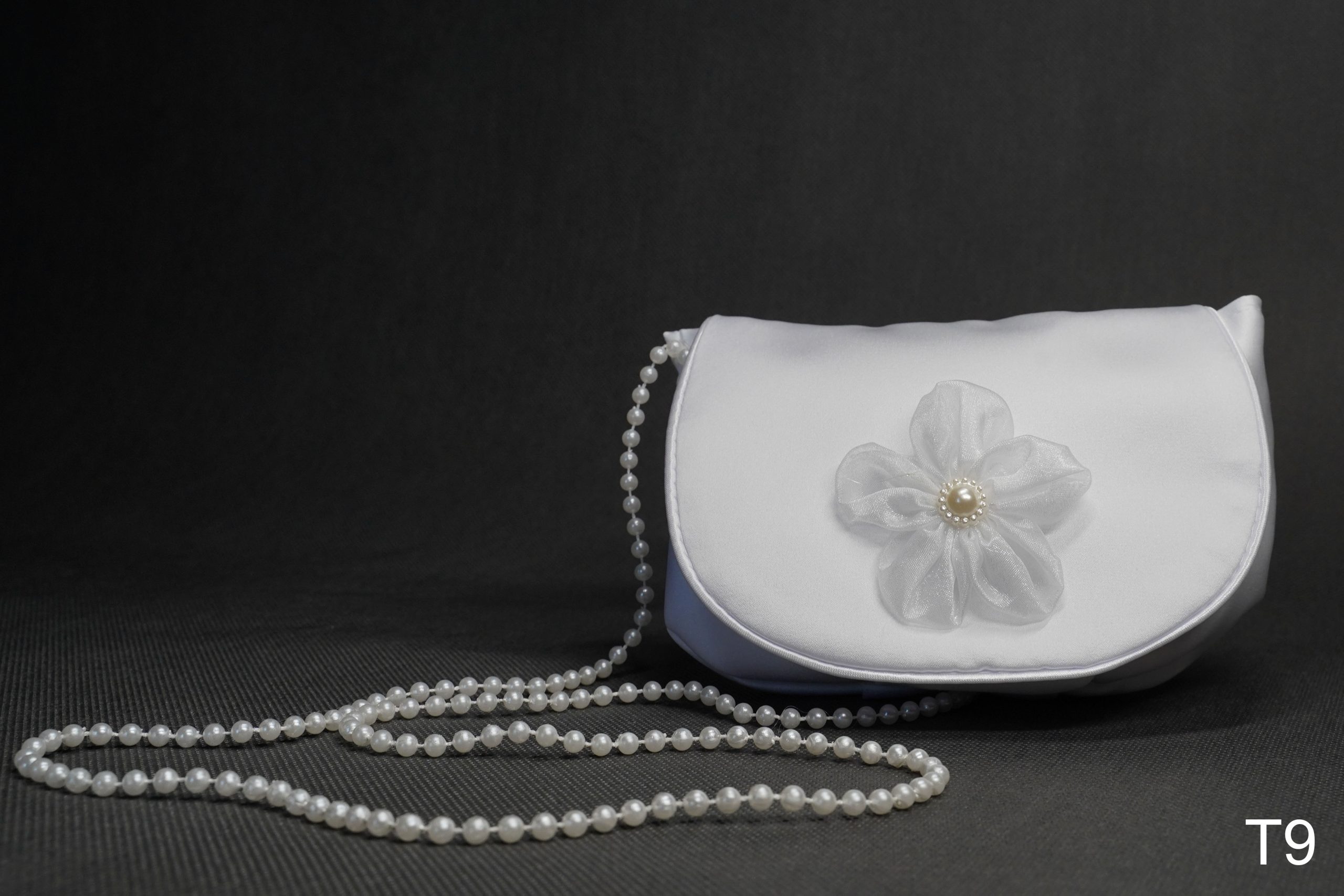 Torebka komunijna uszyta z satynowej tkaniny ,na długim pasku z perełek. Klapka zaokrąglona obszyta lamówką i ozdobiona pięknym kwiatem szyfonowym.