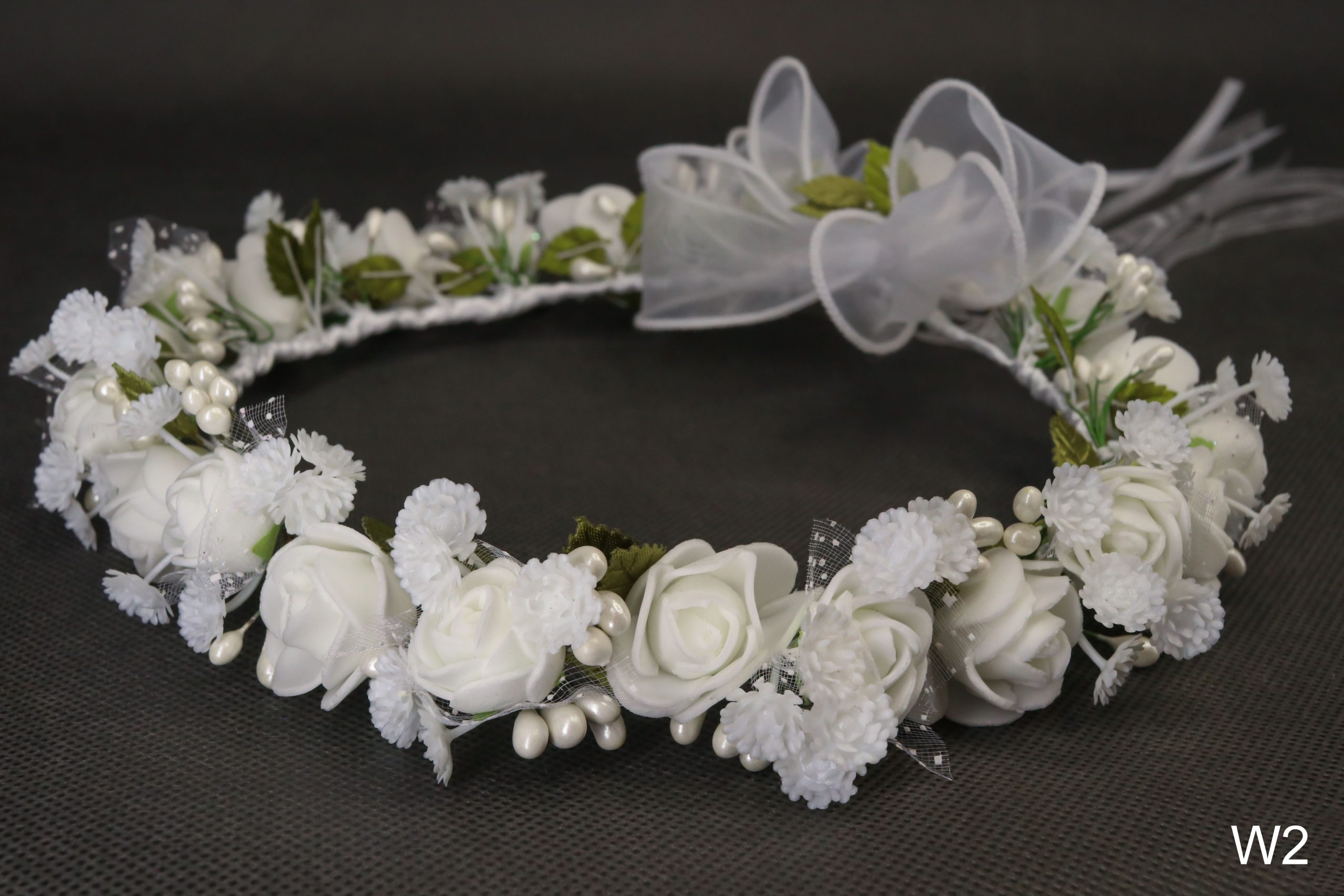 Ręcznie wykonany wianek z piankowych róż, przeplatanych piankowymi pączuszkami z tiulem oraz pręcikami z perełek. Wykończony okazałą szyfonową kokardą