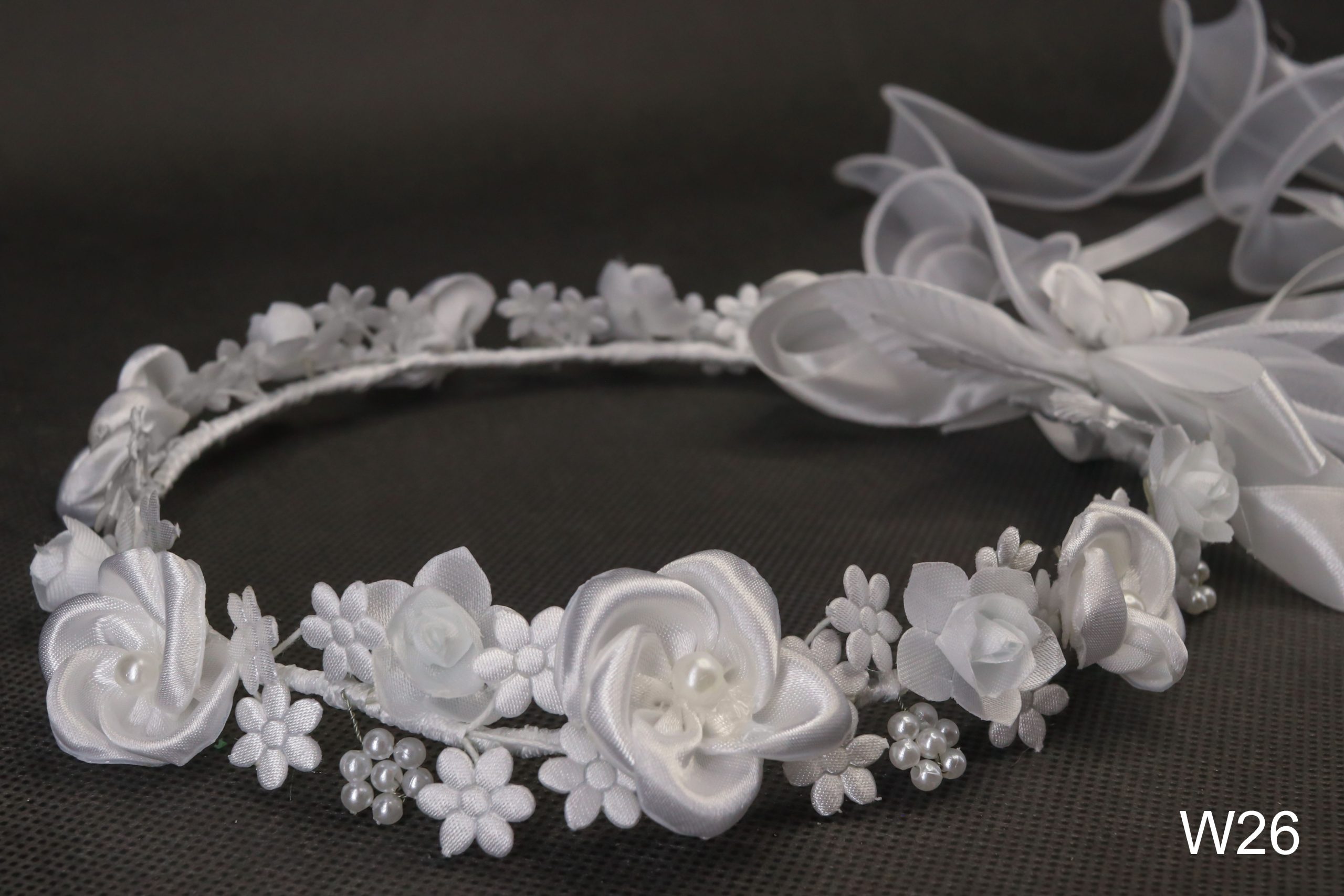 Biały wianek komunijny ręcznie wykonany z atłasowych jabłonek w połączeniu z drobnymi kwiatuszkami, między nimi wplecione kwiatuszki z perełek. Zakończony ałasowe-szyfonową kokardą, zwisające loki z tasiemkami.