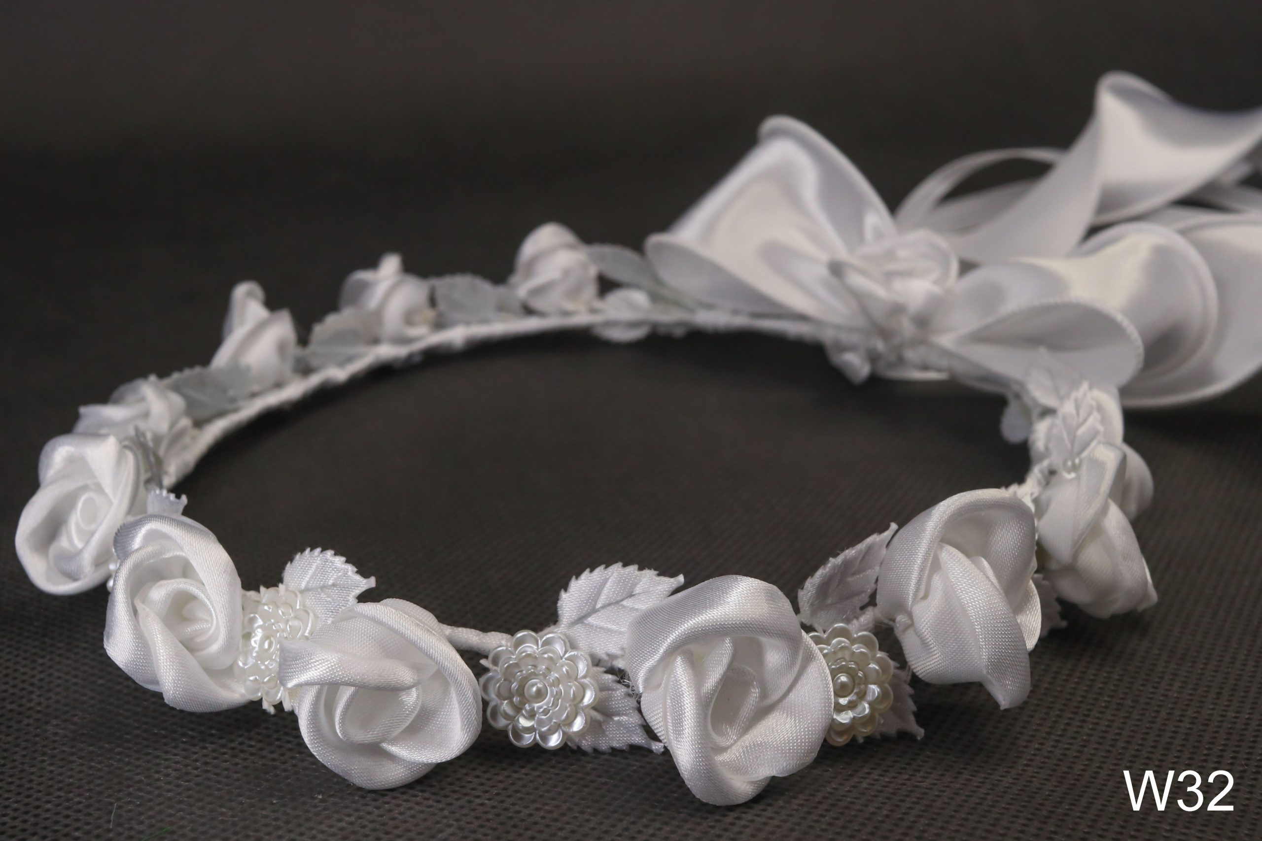 Delikatny wianuszek z białych ręcznie robionych różyczek przeplatanych drobnymi listkami i kwiatkami perłowymi. Wykończony atłasową kokardą i kręconymi atłasowymi lokami.