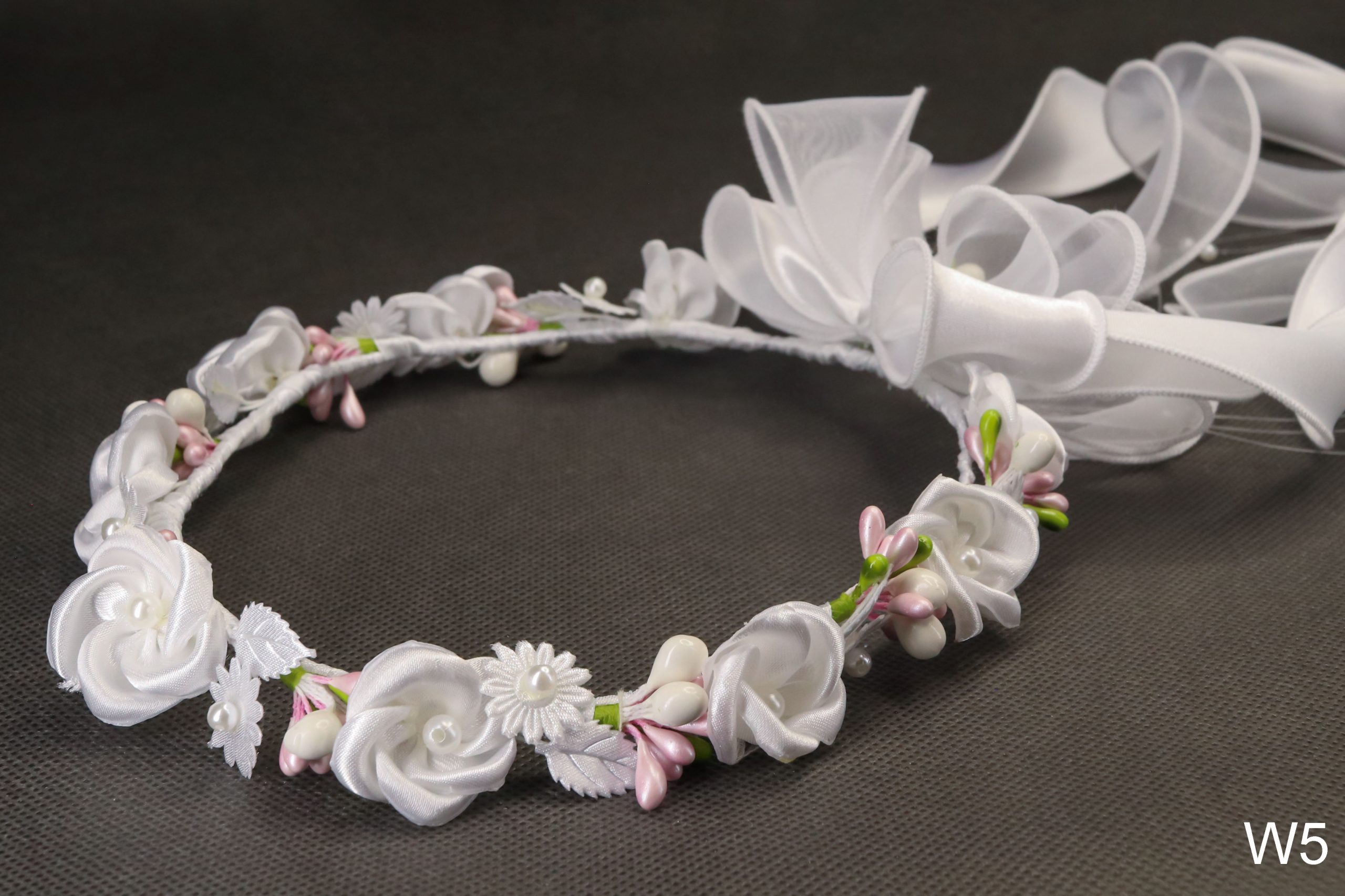Ręcznie wykonany wianek komunijny z atłasowych ręcznie robionych kwiatków jabłoni z dodatkiem atłasowego słoneczka i listka ozdobiony delikatnie różowym ozdobnikiem. Wykończony atłasowo szyfonową kokardą wraz ze zwisającymi lokami.