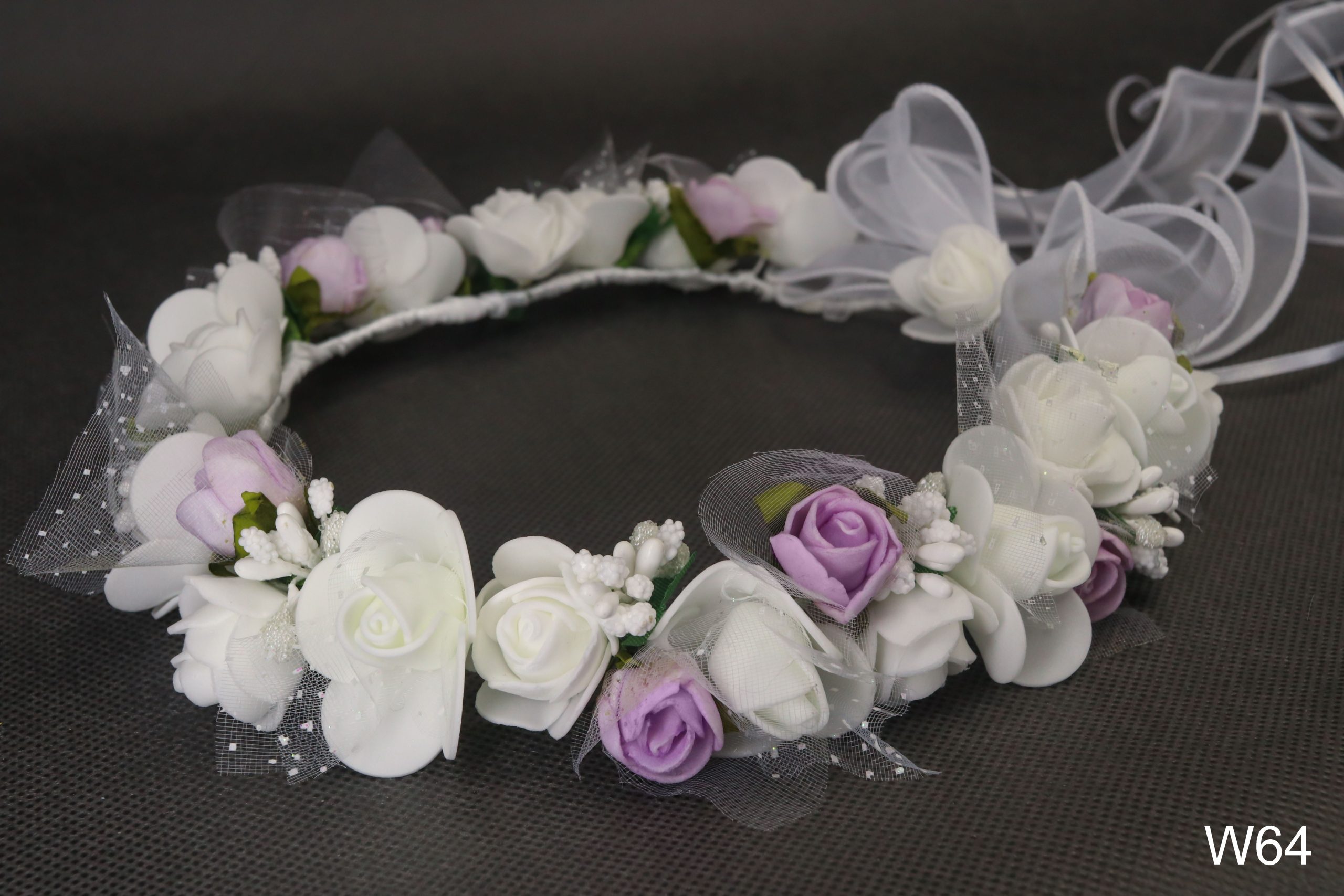 Bogaty wianek z piankowych różnej wielkości różyczek. Zakończony szyfonowa kokarda.