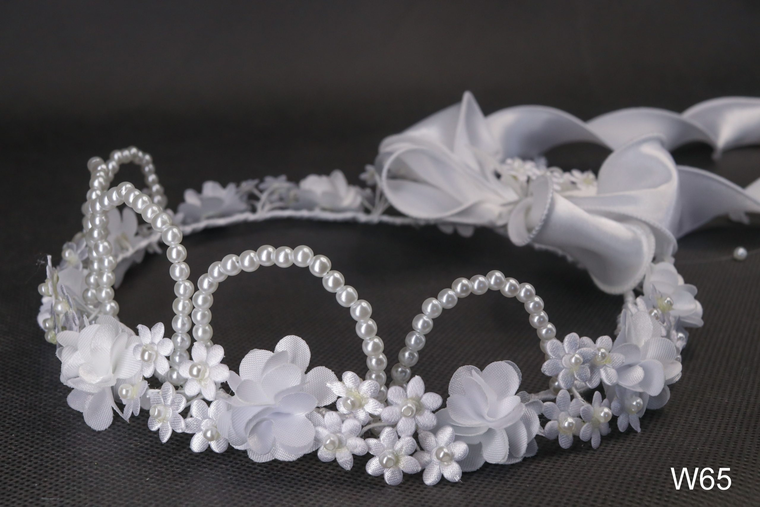 Wianek z atłasowych kwiatków z koroną z perełek. Zakończony atłasowa kokardą i długimi lokami.
