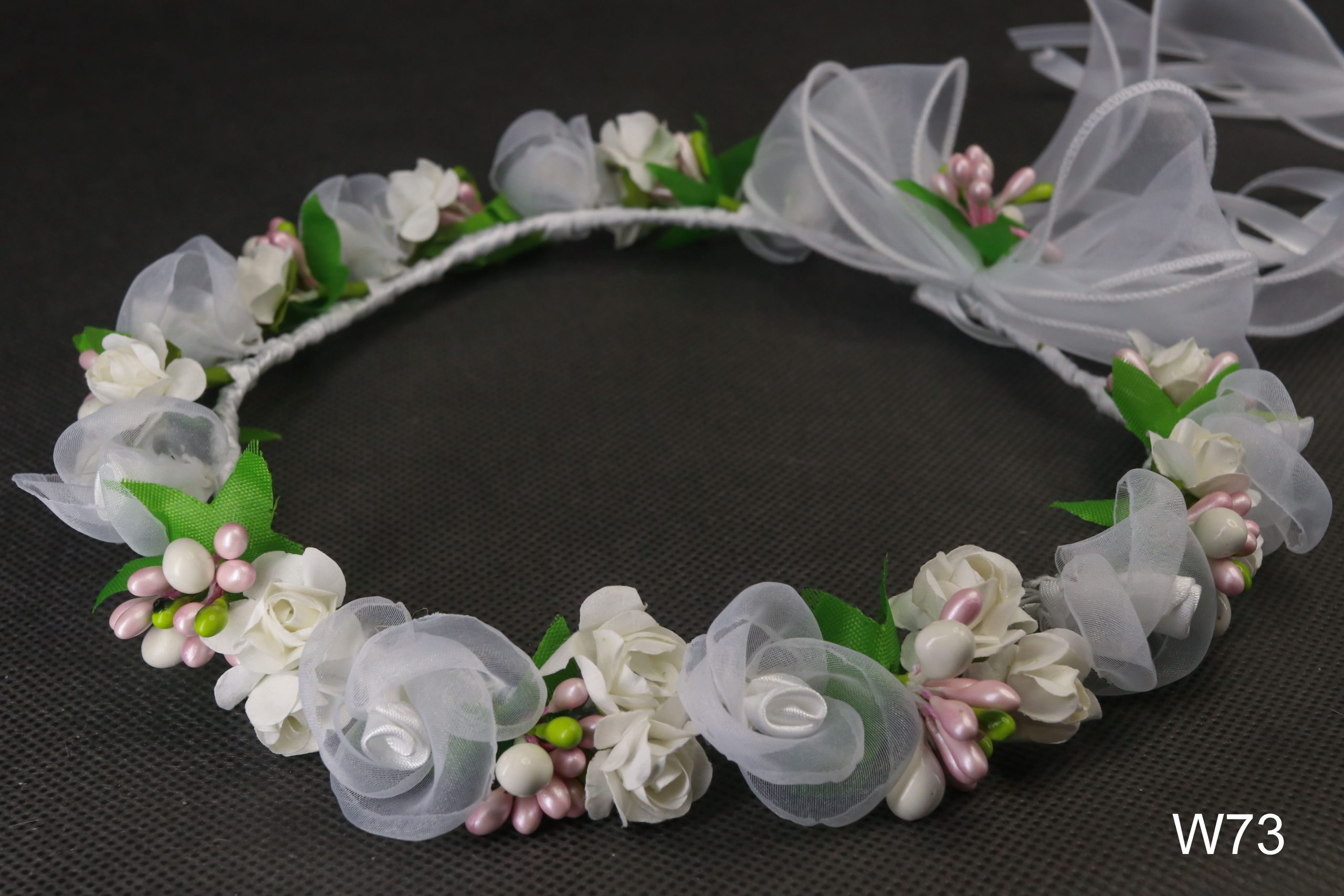 Elegancki wianek z szyfonowych różyczek z dodatkiem papierowych kwiatów i różowego ozdobnika. Z tyłu szyfonowa kokarda.