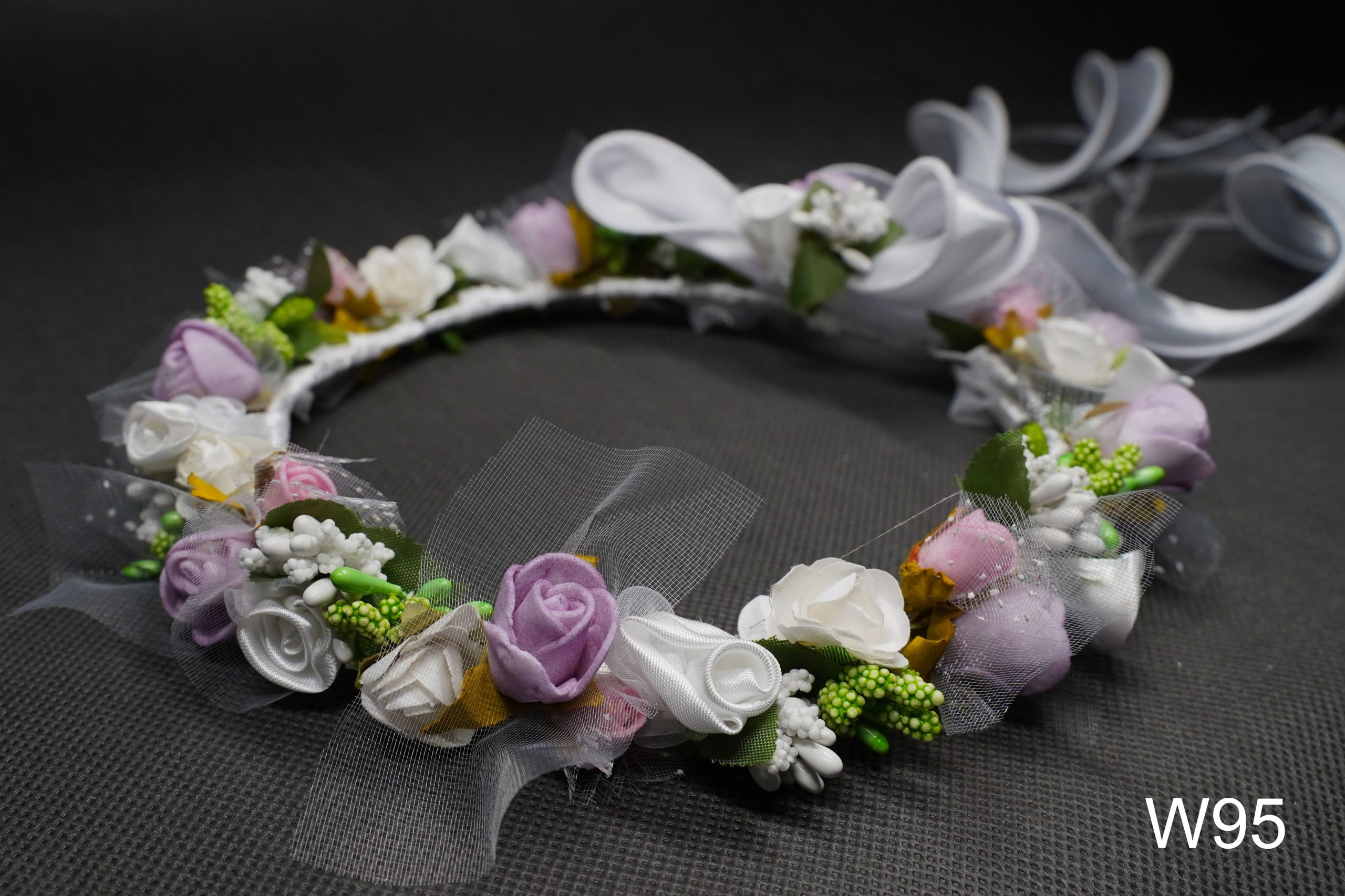 Elegancki wianek komunijny z różnych kolorowych kwiatów białych ,różowych, fioletowych oraz zielonych .Wianek wygląda „jak żywy”.Zakończony atłasową kokardą i pięknymi kręconymi lokami.